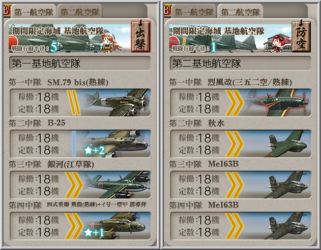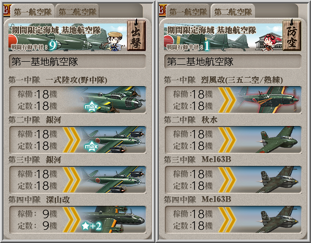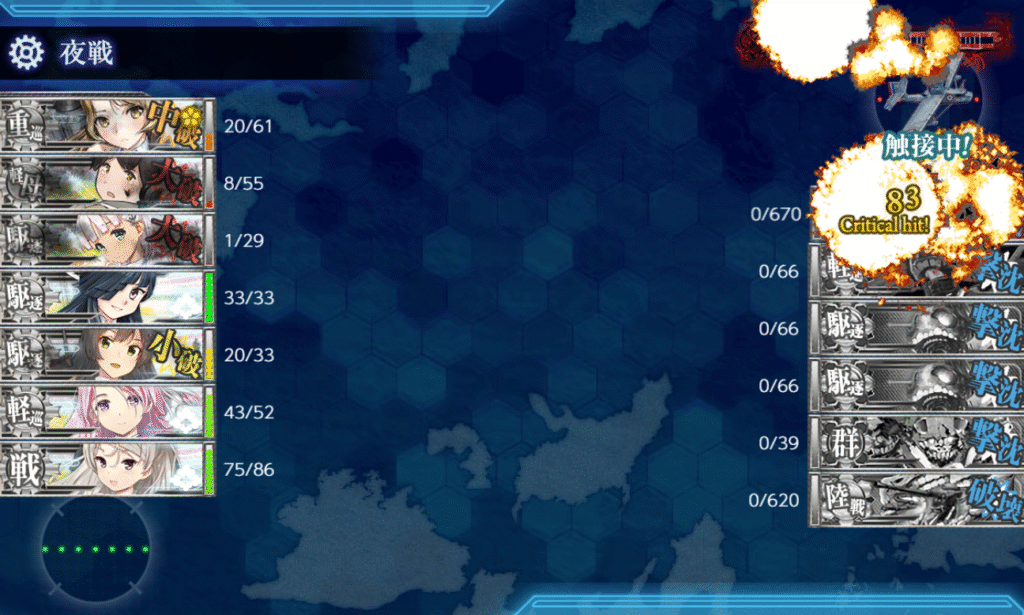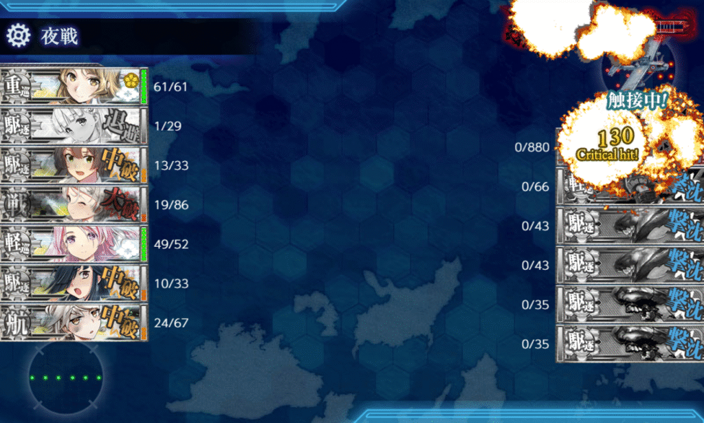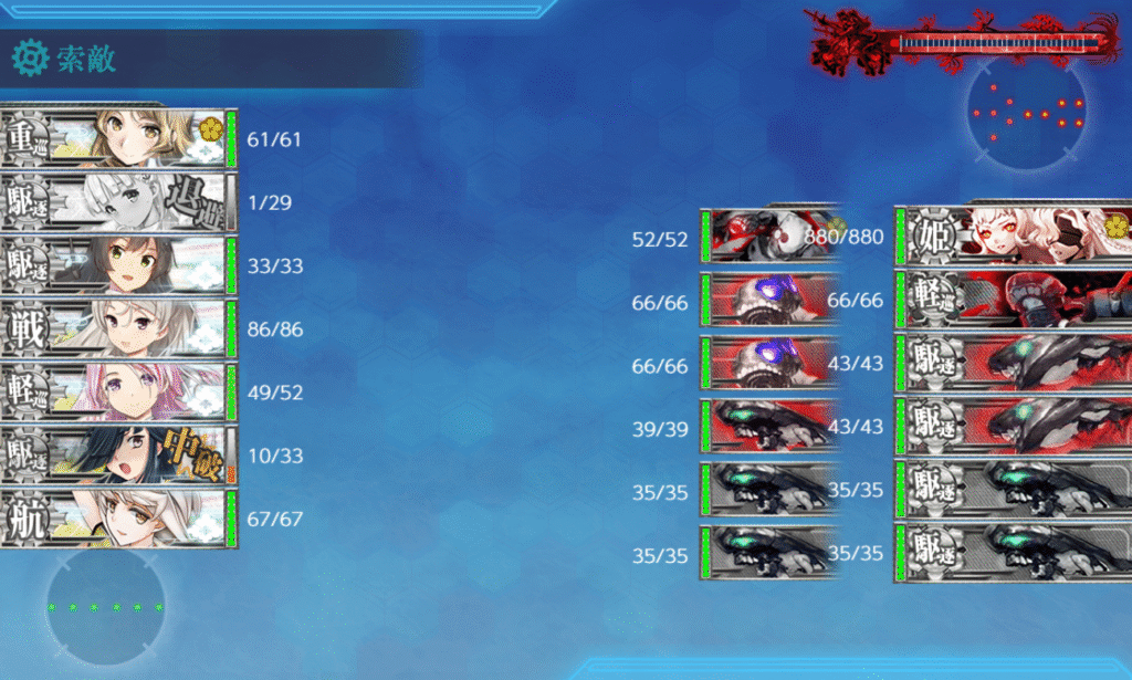 道中の空襲の対策に秋月型駆逐艦を加えたいところでしたが、今後のために温存しています。道中の潜水艦のために対潜艦を2人にしました。基地航空隊はボスに送って支援艦隊を送らずで、この編成で削りは順調に行えました。
