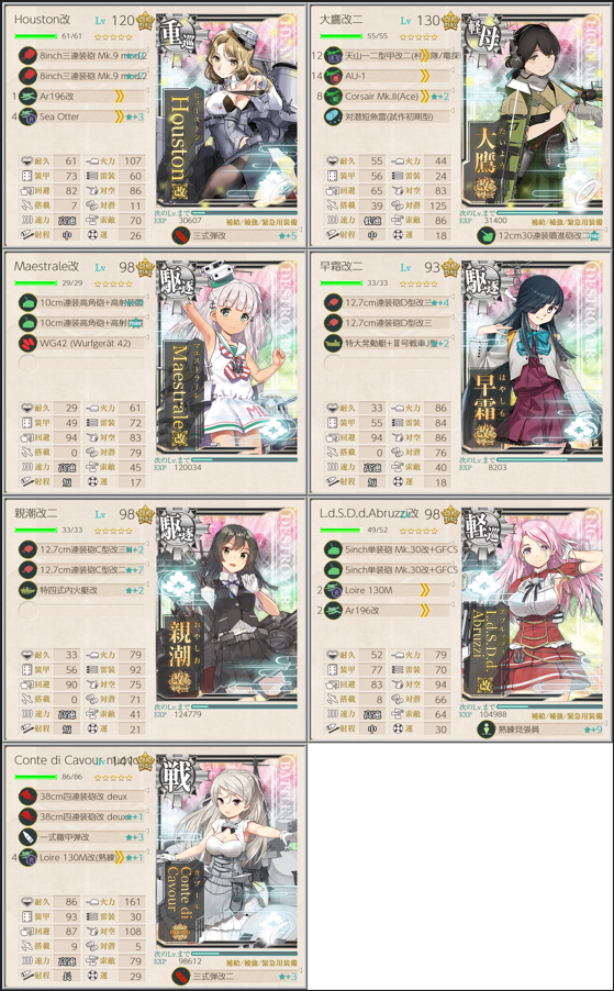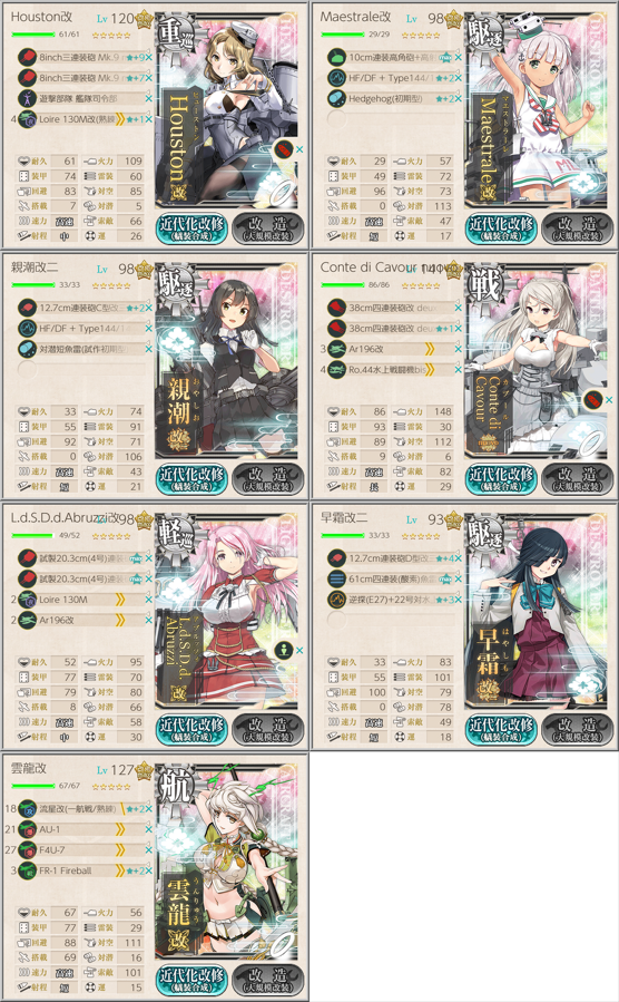 対潜艦を1人に減らしカットイン艦を増やしています。補強増設を未使用で熟練見張り員を装備できず運の値も高くないメンバーでカットインを狙うことからマエストラーレには探照灯を装備してもらいました。