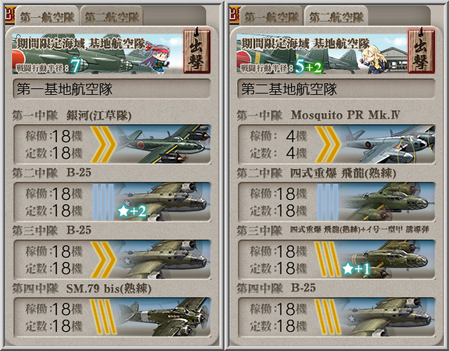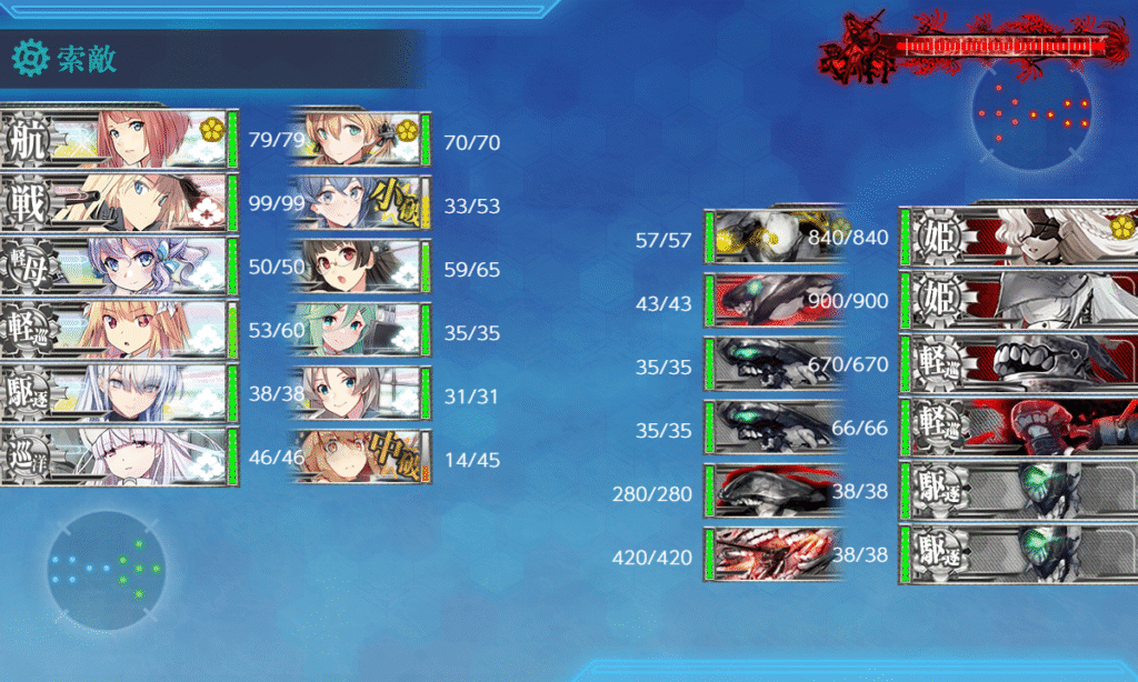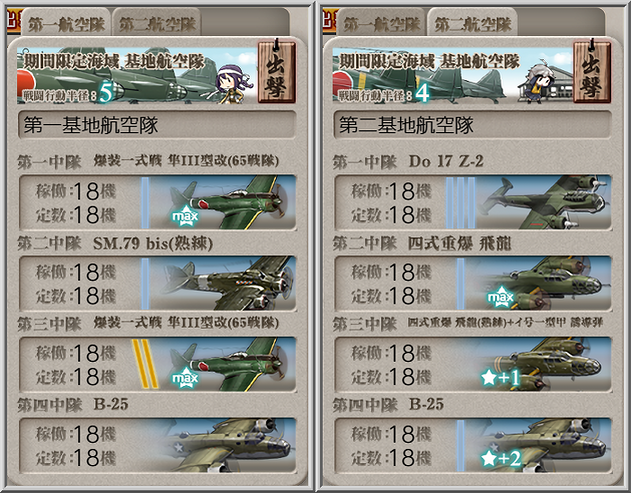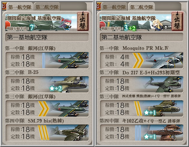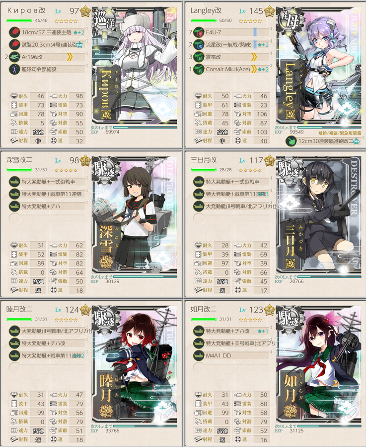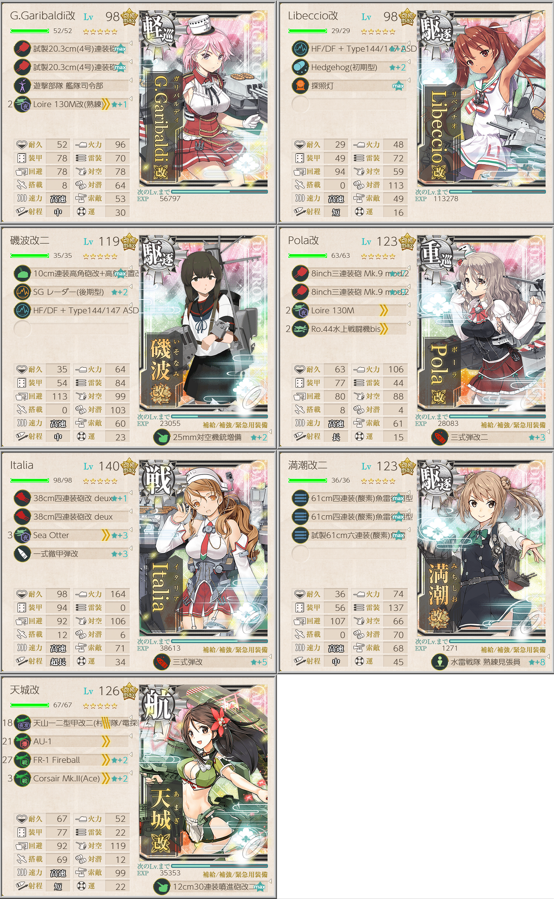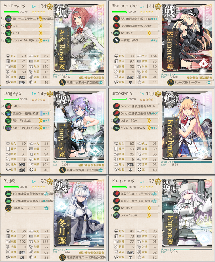 例によって攻略サイトそのままのメンバーです。削りではブルックリンは連撃装備にしています。装備もそのままにしようとしていますが、水偵が足りず特攻表を見ながら調整しましたがこれでよかったのか…。