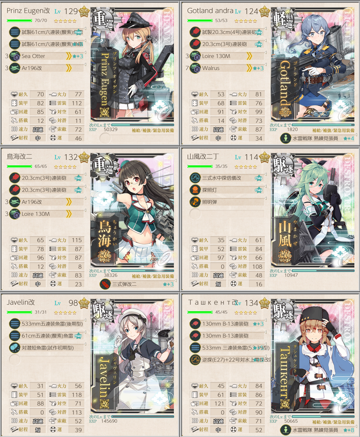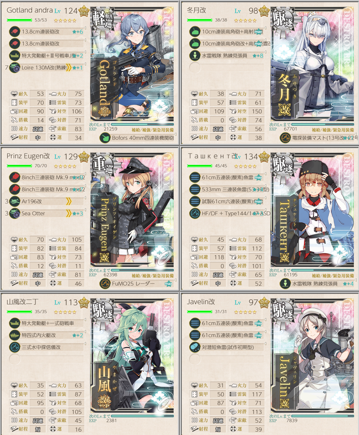 削りでは対潜要因を3人用意しました。タシュケントは2スロ対潜装備にしてますが、ゲージ2の時に1スロで問題なかったので1スロ対潜でよかったなと今見直して思っています。