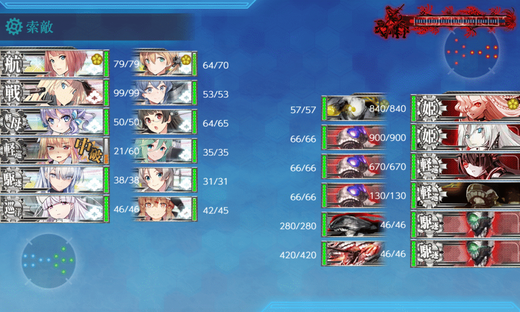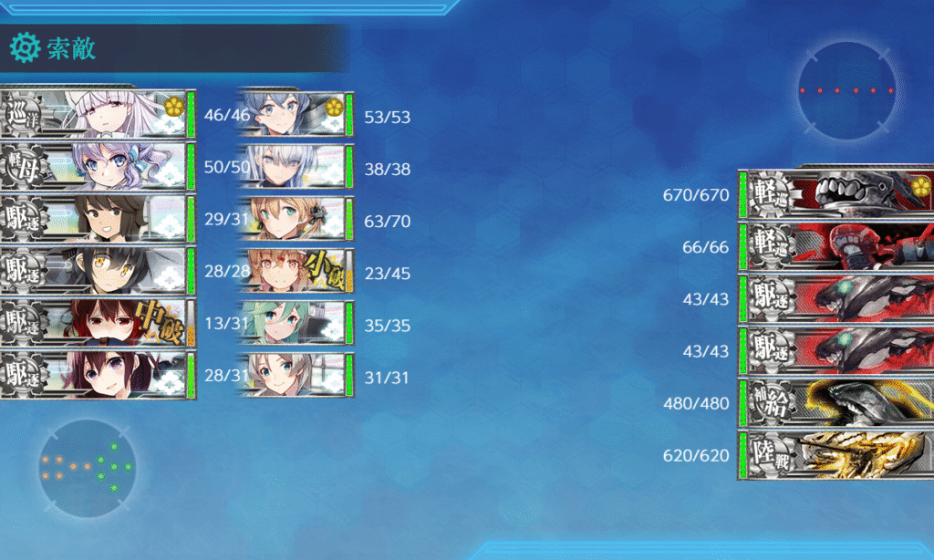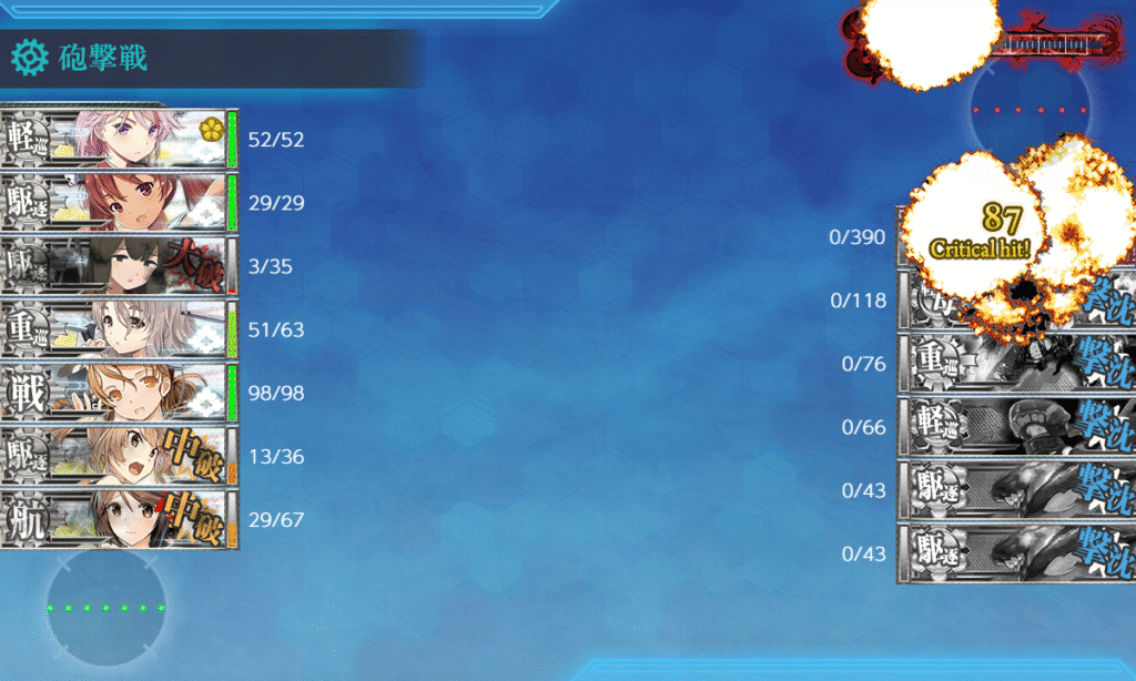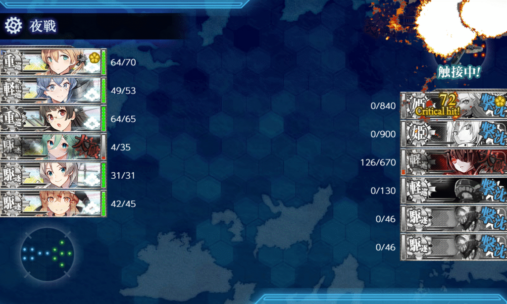 ボスの装甲破砕も行い準備万端で向かいます。基地航空隊や決戦支援でナ級の2体の撃破に成功しての同航戦。昼戦のラストにキーロフが連撃で相手軽巡を落として残り3体にします。