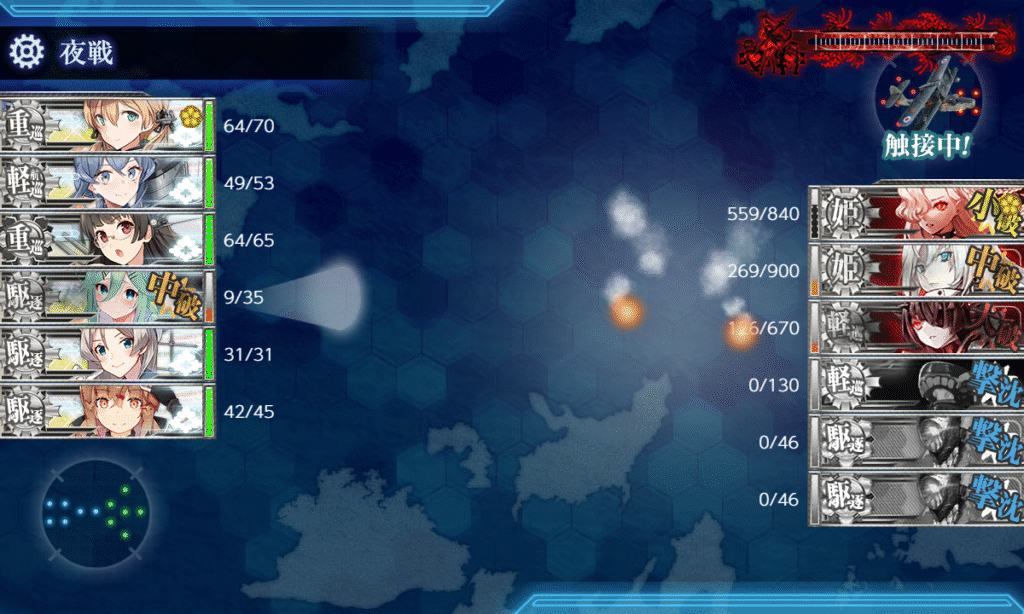 夜戦開始時は第2艦隊は探照灯持ちの山風が中破のみ。