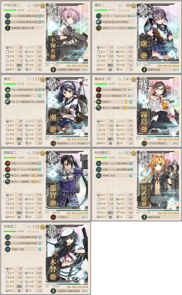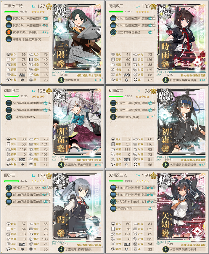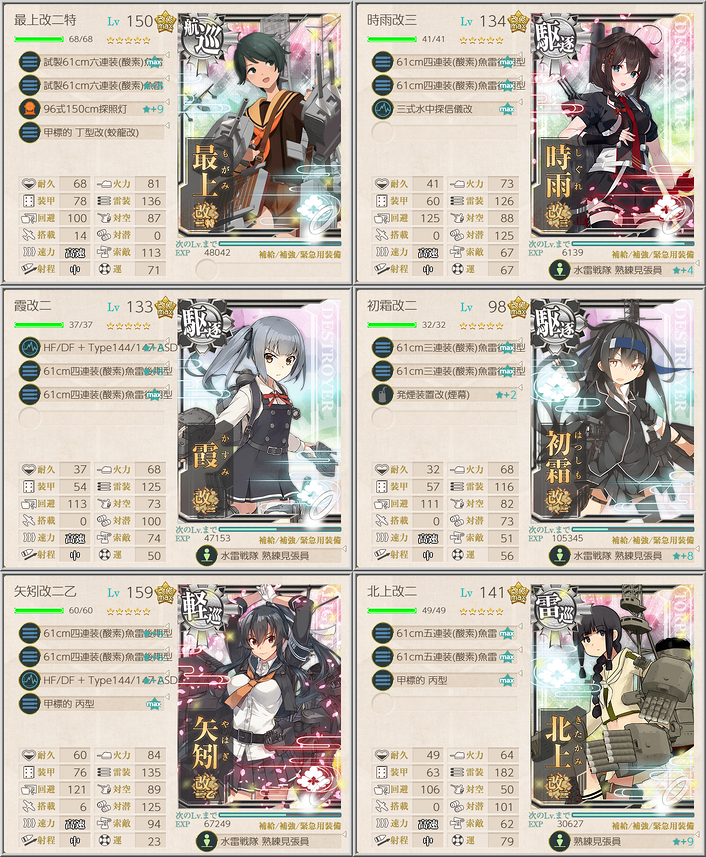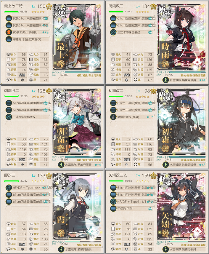 攻略サイトそのままのメンバーですが道中の安定に対潜要員を増やすために矢矧に対潜装備を持たせました。