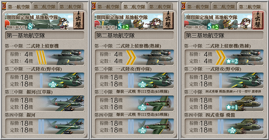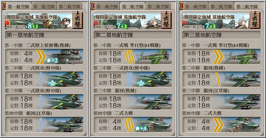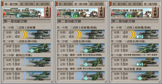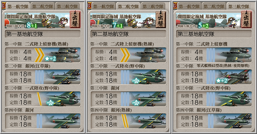 矢矧も対潜もあきらめ夜偵を持って火力を意識した編成にしました。これ以上は対潜を減らしたくなかったので発煙装置は2個で3重のモクモクが出ることをお祈りしました。そして基地航空隊は編成のスクショ取り忘れ・・・。攻略サイトと同じように組んでいたはず…。