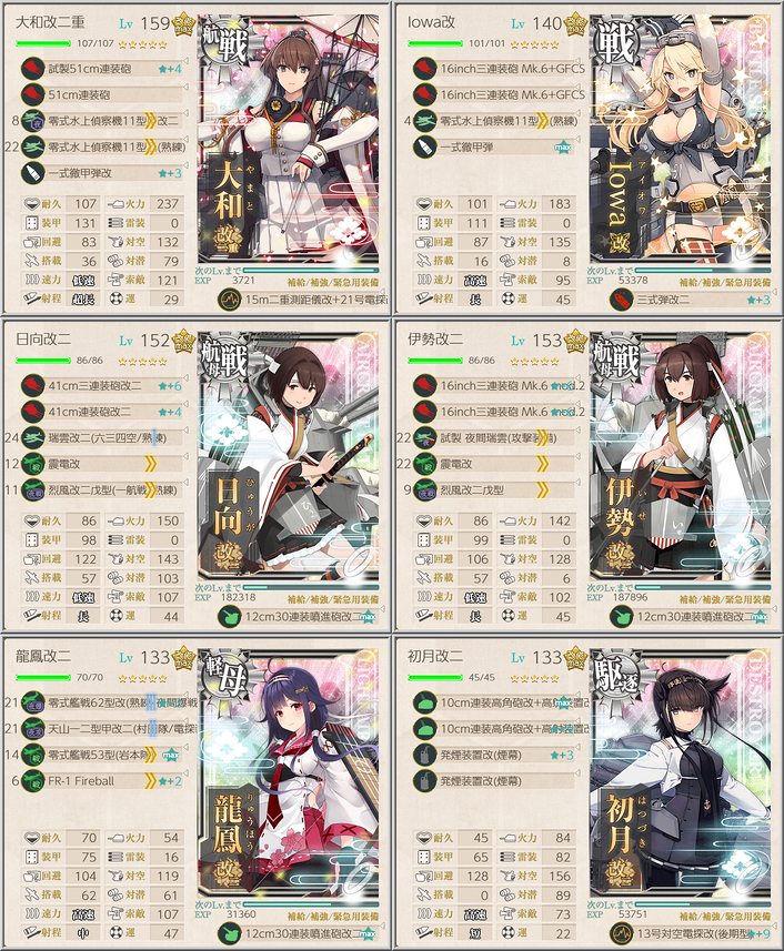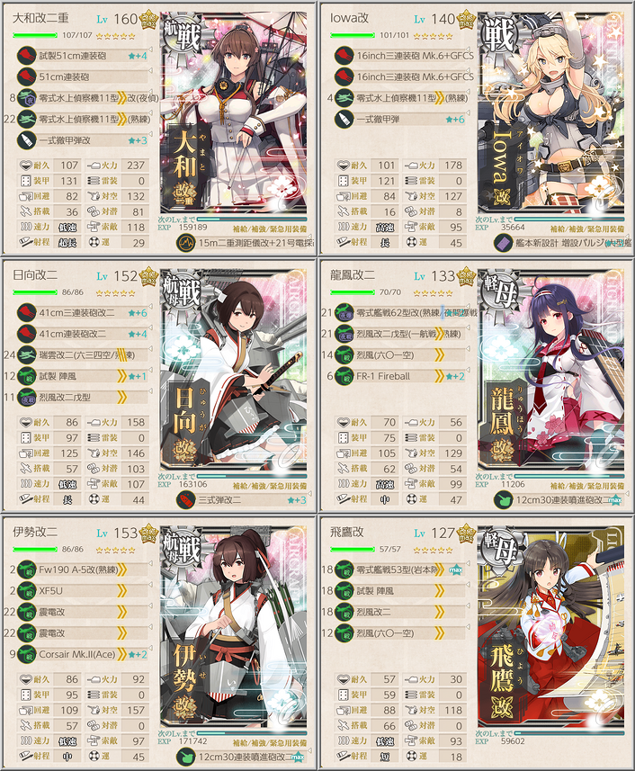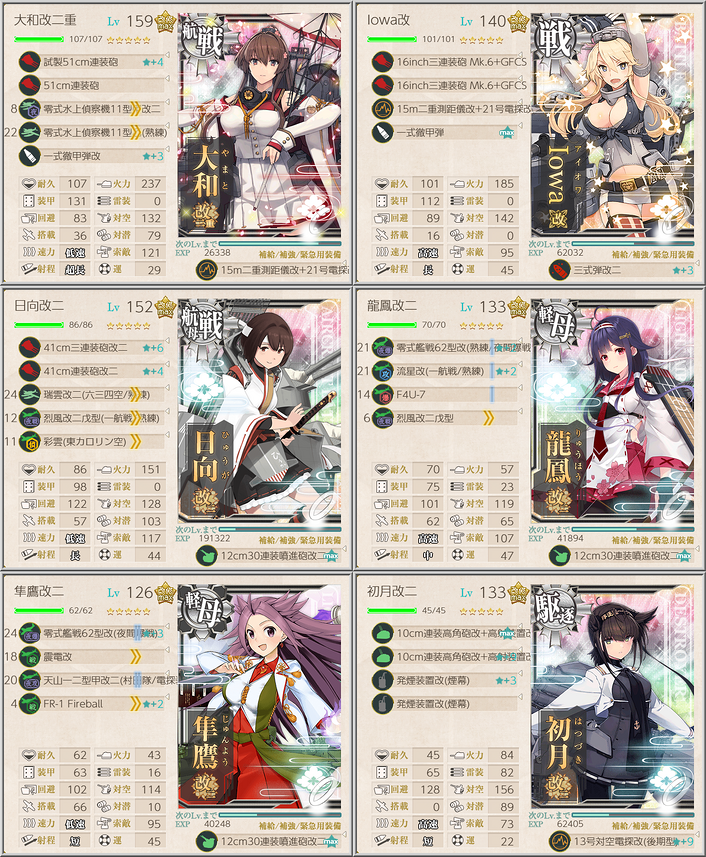 アイオアは道中安定のために偵察機をのせて連撃させていましたが、タッチの発動率を考えたら電探のままでよかったと思います。