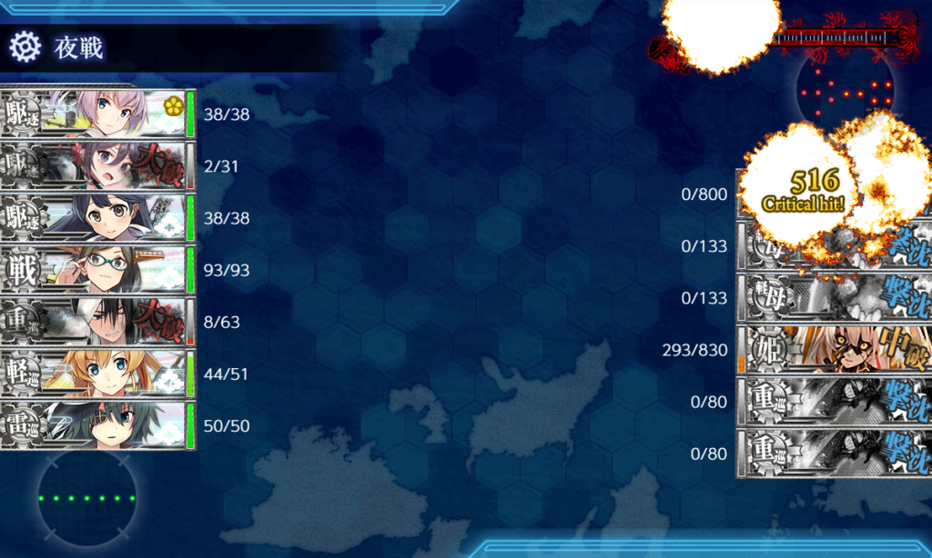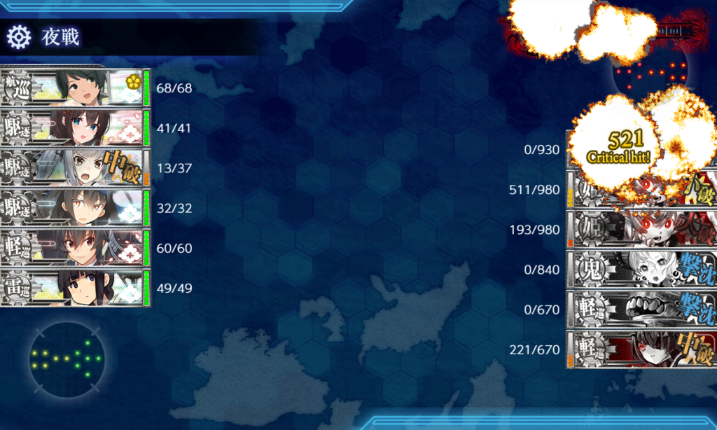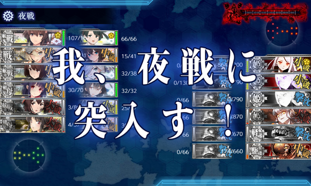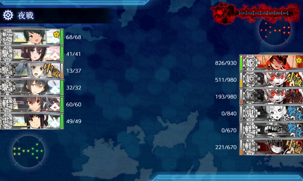 無傷で道中を突破してのボス戦です。基地航空や支援艦隊による砲撃と昼戦で相手の第2は壊滅しましたが、第1は4体残してボスもほぼ無傷の状態で夜戦に突入です。こちらの第2も全員動ける状態で狙いによってはありえる状況でした。