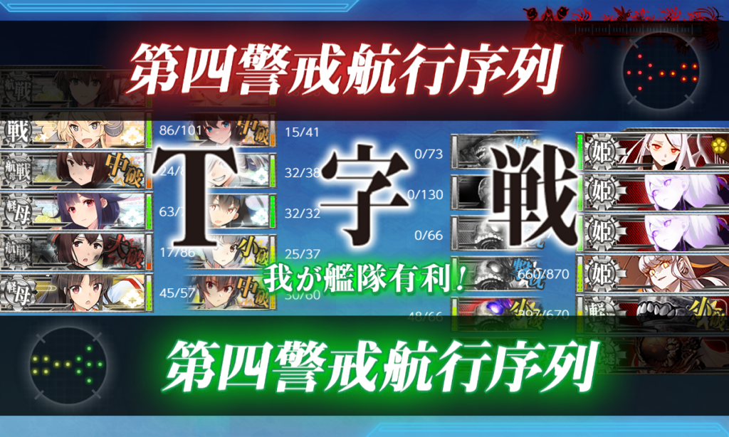 基地航空隊、航空戦、支援艦隊、先制雷撃が終わった後でかなりのメンバーが負傷しましたがタッチが発動できる状態でT字有利。そこからタッチ発動で数を減らし、その後は削っていきます。