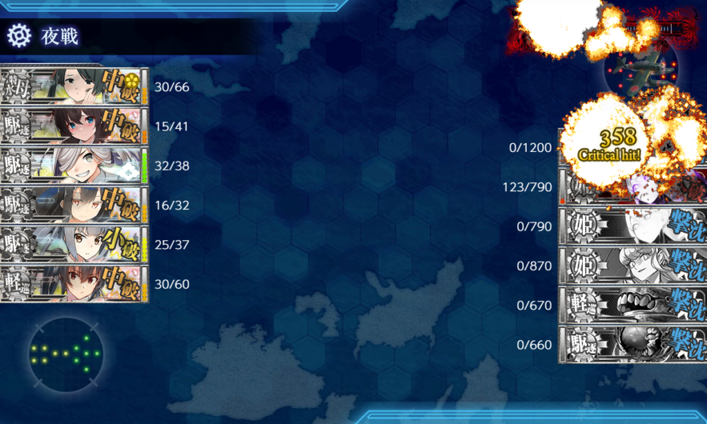 道中で撤退することが少しありましたがボスまでたどり着くと容易に削れました。順調に削りを進めラスダンに突入。ラスダンだけ決戦支援を送りました。航空戦を終えた時点で相手は壊滅状態。そこから昼に削って夜戦に。