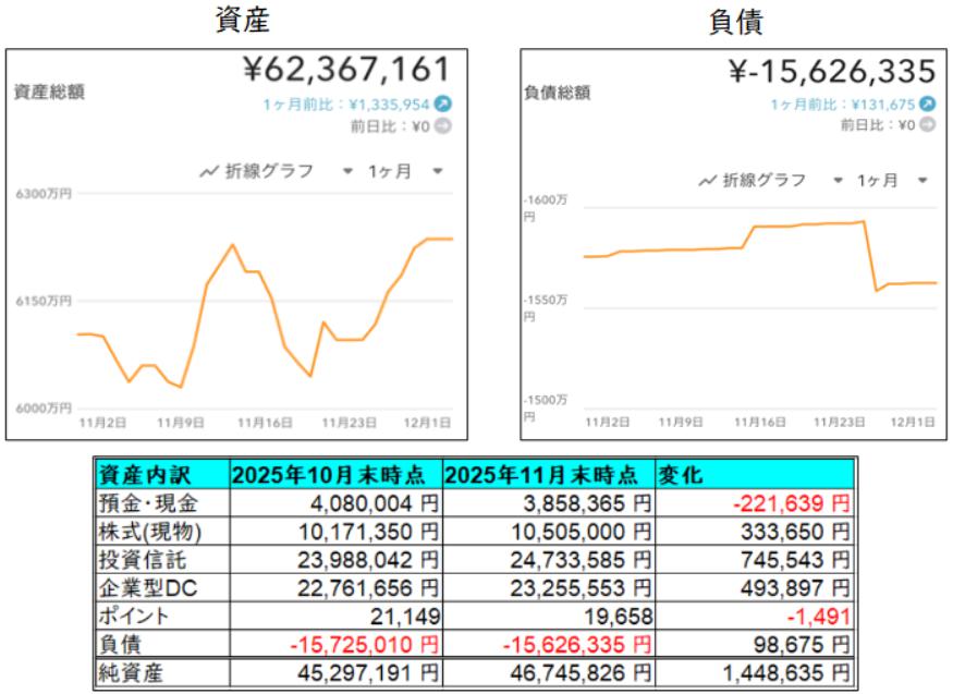 今月もすごく調子がよかって純資産+144万円。準富裕層へと着実に近づいていっています。やはり現金の減りが気になりますが来月はボーナスもあることから少し回復するはず。そしてそろそろ来年度の新NISAをどうするのかを考えないといけない時期です。年初に一括で入れる資金はボーナスでも無理ですので、株資産を一部売却してNISA枠への移動も考えないといけないかも…。日本株の含み損もありますので、12月は持っている資産の整理をして来年に備えたいと思います。