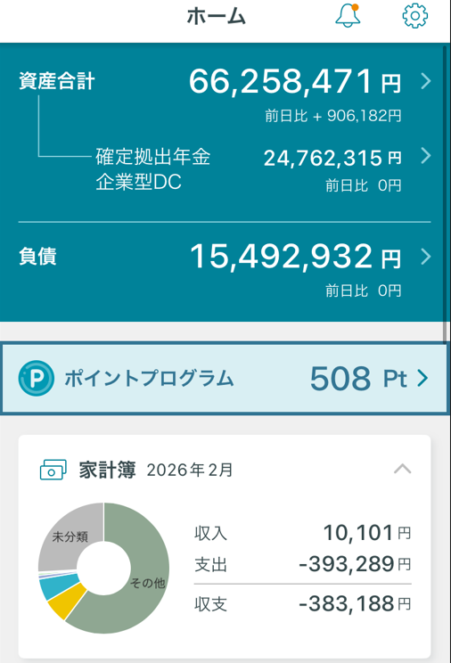 トップ画面は資産合計に加えて確定拠出年金や負債が別に表示されており非常に見やすいです。